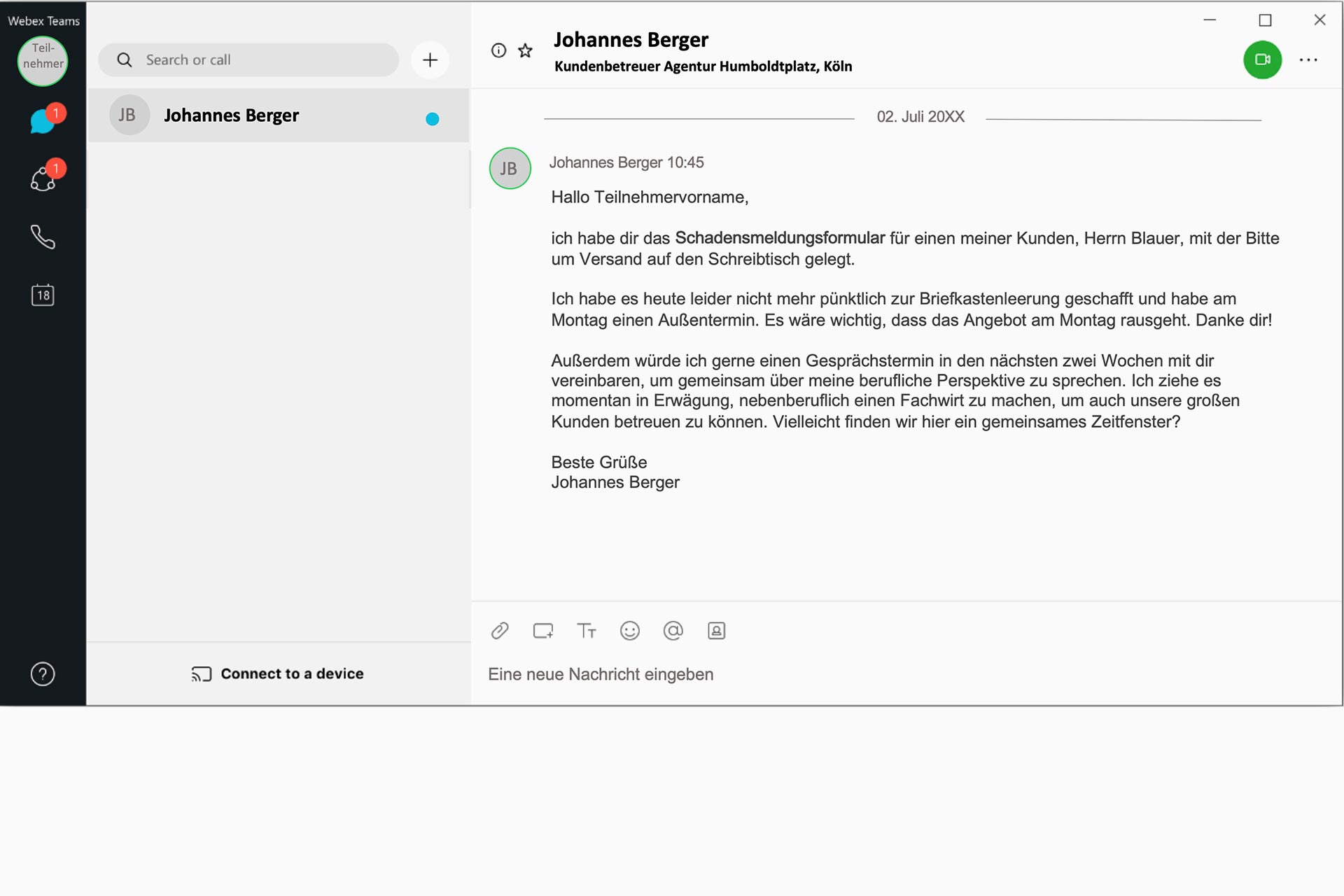 Nachfolgend eine Webex-Mitteilung vom Kundenbetreuer Hr. Berger bezüglich eines Schadensmeldungsformulars und eines Gesprächstermins.